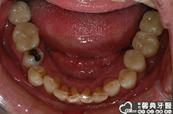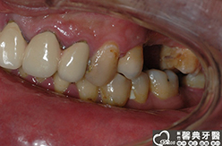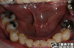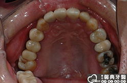 - 全口牙周病,伴隨多顆缺牙,包括:右上第二小臼齒、右上第一大臼齒、右下第一大臼齒,以及右下第二大臼齒、左下第一大臼齒、左下第二大臼齒等共六顆缺牙。